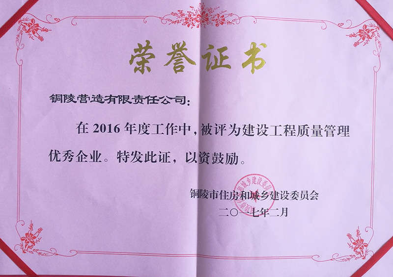 銅陵營造有限責任公司是國家住建部核準的房屋建筑總承包一級企業。2006年7月,企業二次改制為民營企業,并更名為“銅陵營造有限責任公司”。目前,公司擁有房建施工總承包、市政公用工程總承包、鋼結構專業工程承包、建筑裝修裝飾專業工程承包四項壹級資質,機電安裝、起重設備安裝、建筑幕墻三項貳級資質,地基與基礎一項叁級資質。2008年通過北京恩格威ISO9001、ISO14001和OHSAS18001“三合一”體系認證。